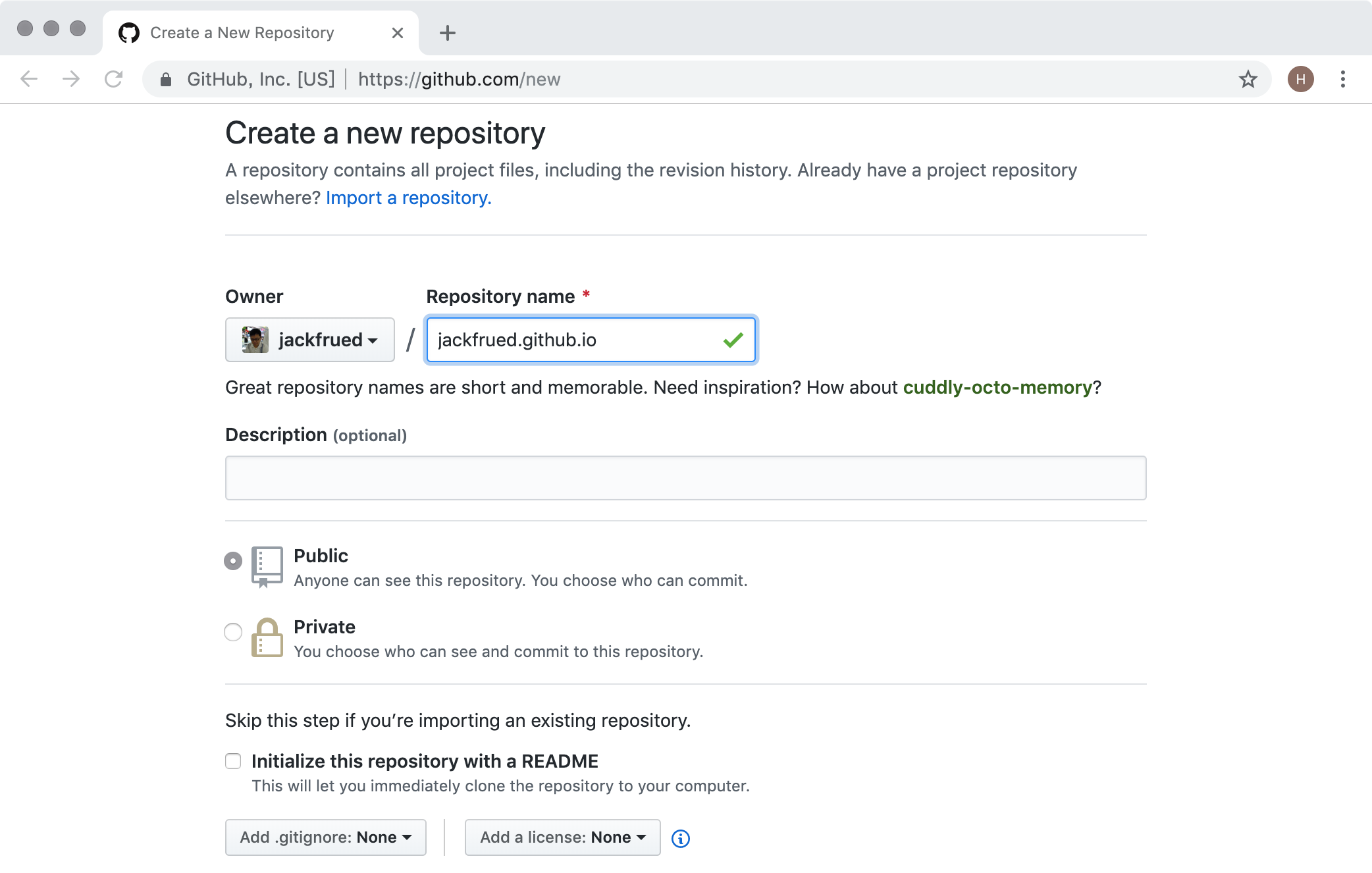 - 根据自己的用户名创建一个仓库,仓库一定要取名为“用户名.github.io”。例如:我在GitHub上的用户名是jackfrued,那么我的托管博客项目的仓库一定要命名为jackfrued.github.io。